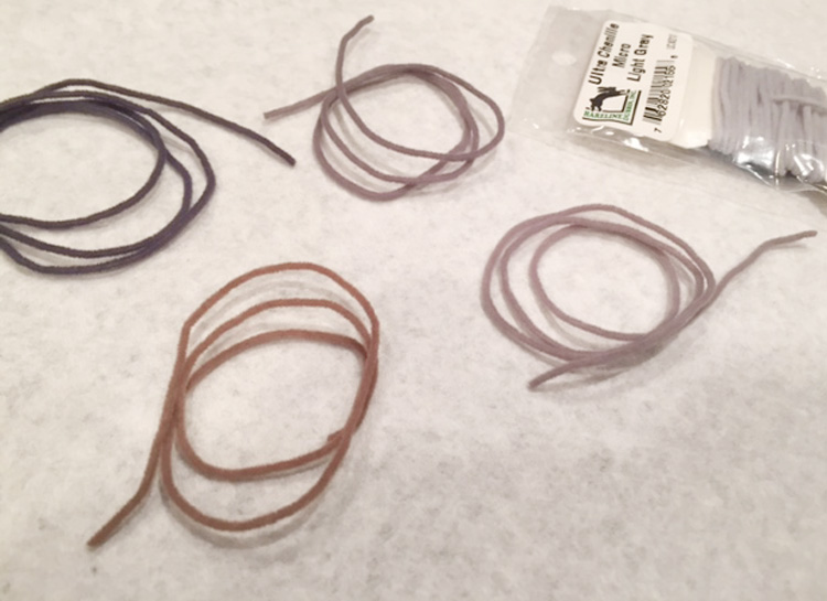 The above photo shows micro chenille that has been dyed using the process as described. The lightest above chenille is the original light gray color. The other four gray versions run from a warm light gray, a deeper value warm gray, a bronze warm gray, then finally to a dark warm charcoal color. Often micro chenille that comes off of the card is kinked and matted, once it is dyed and blow dried it puffs up again and retains its original shape.